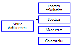 Informations : Etablissement, Article, Mnémonique, Code EAN, Code ITF, Intitulé, Intitulé réduit, Fonction de valorisation (Intitulés), Fonction (Intitulés), Ordre, Perte autorisée, Mode de vente (Intitulés), Péremption, Gestion (Nom), Tiers commettant, Taux de commission.