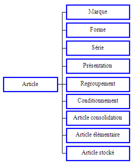 Informations : Marque (Intitulés), Présentation (Intitulés), Forme (Intitulés), Conditionnement (Intitulés), Regroupement (Intitulés), Série (Intitulés), Article de consolidation associé (Intitulés) et quantité correspondante, Article déterminant associé (Intitulés) et quantité correspondante, Article stocké associé (Intitulés) et quantité correspondante, Fonction, Péremption, Poids net et brut, Volume net et brut.