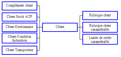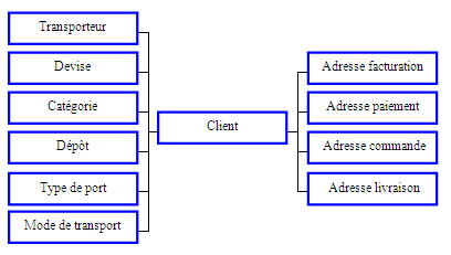Informations : Tiers commande client, Adresse commande client, Forme juridique, Nom, Nom réduit, Adresse 1, 2 et 3, Code postal, Ville, Pays, Téléphone, Fax.