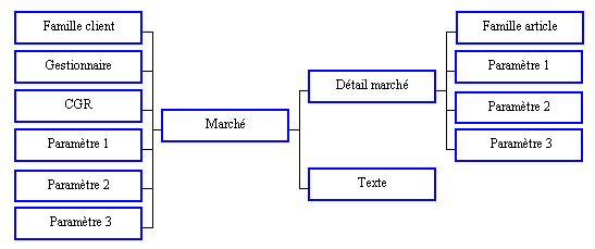 Informations : Etablissement, Marché, Intitulé, Mnémonique, Famille client (Intitulés), Devise, Cours, Date de début de validité, Date de fin de validité, Gestionnaire (Nom), CGR (Intitulés), Montant HT et TTC prévu, en-cours et réalisé, Indicateur de blocage en montant, quantité et date, Indicateur marché par défaut pour la famille de client.