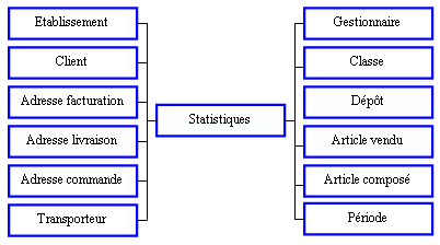 Informations : Etablissement, Gestionnaire (Nom, Prénom, Supérieur), Secteur, Client, Catégorie, Article (Intitulés, Catégorie), Mode de ventes, Classe, Devise, Période, Type de période, Dates de début et de fin de période, (Année, Trimestre, Mois), Type de statistiques, Marchés, Dépôt, Transporteur (Intitulés), Article composé (Intitulés).