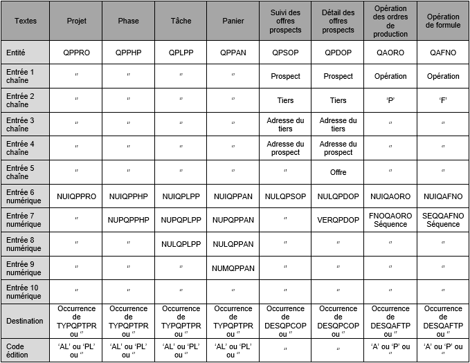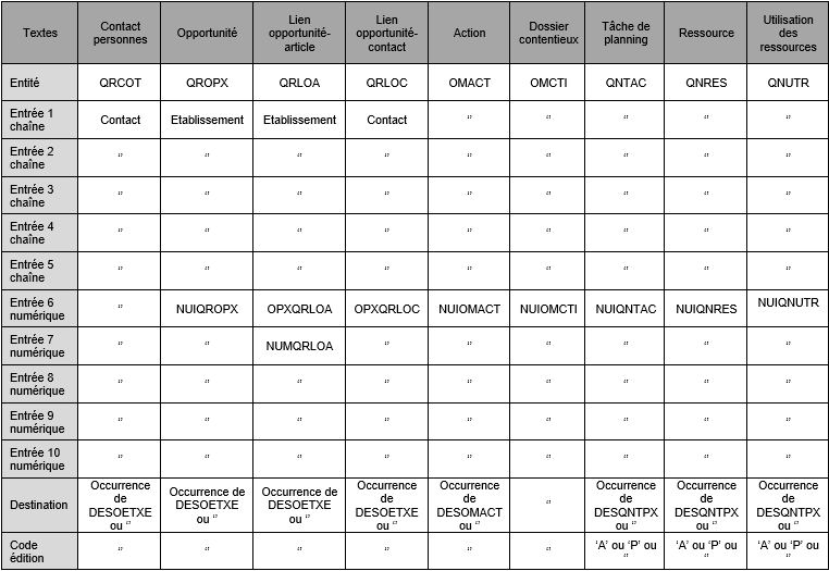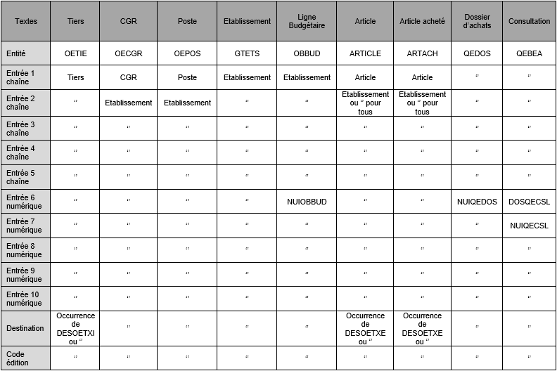Dans le tableau ci-dessous, vous trouverez comment renseigner les entrées en fonction de l'entité demandée :