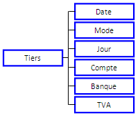 L'intégration d'informations des tiers dans un métier personnalisé nécessite l'intégration du métier paramétrable Tiers détail (TIE-DETP), et du métier de liaison correspondant au tiers (en BLEU clair sur le schéma).