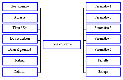 Informations : Paramètre 1 à 5 du tiers concerné (Intitulés), Famille tiers concerné (Intitulés), Groupe tiers concerné (Intitulés), Rating (Intitulés), Cotation (Intitulés), Etablissement de tous les paramètres du tiers concerné.