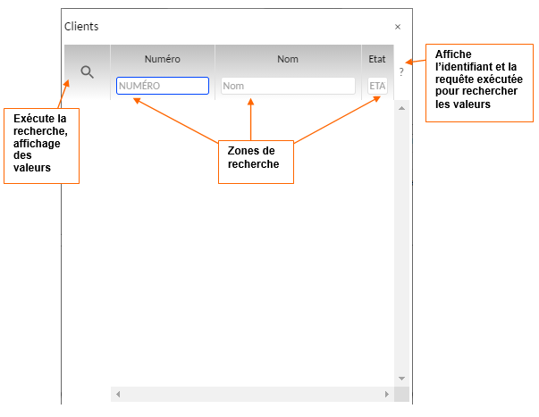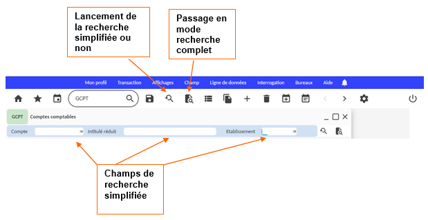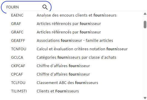 Dans le cas où vous ne connaissez pas le mnémonique d'appel, un moteur de recherche intégré vous guide. En tapant des mots-clés, une liste de transactions est proposée, en cliquant sur la transaction voulue celle-ci s'ouvre.