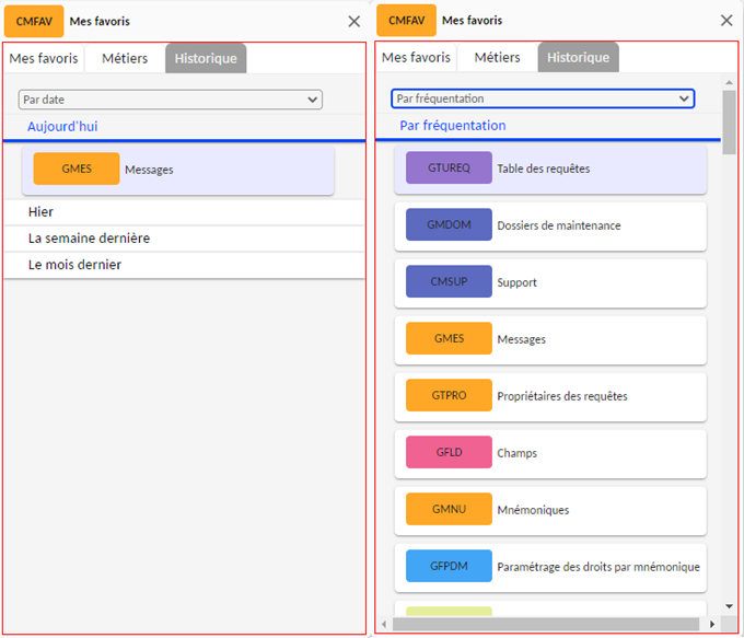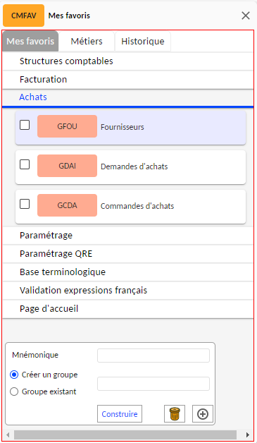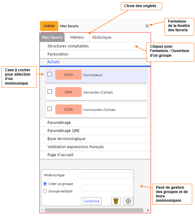 Pour faciliter l'utilisation du produit pour un utilisateur occasionnel ou novice, des favoris sont disponibles sur l'interface. Il s'agit des mnémoniques couramment utilisés par l'utilisateur.