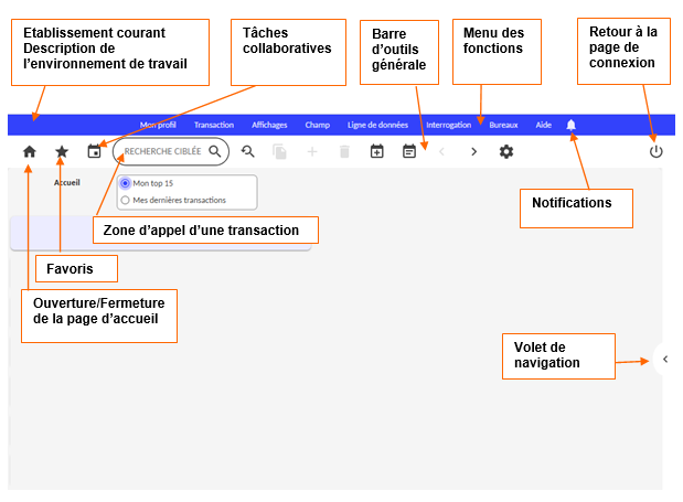 Selon le paramétrage du profil (GUSF) de l'utilisateur qui se connecte (profil défini par défaut dans les délégations GDLU ou profil spécifié dans "Mon compte"), la page d'accueil peut être remplacée par l'ouverture automatique d'une transaction, qu'il s'agisse de la première connexion ou des suivantes.