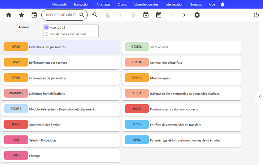 Sur la page d'accueil, sont affichées les transactions les plus fréquemment utilisées. Par défaut, 15 transactions sont visibles (top 15), ce nombre est réglable pour le compte de l'utilisateur ou à défaut avec la variable globale WADM_HOMTOP.