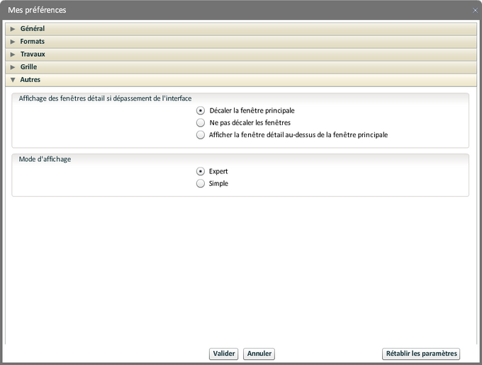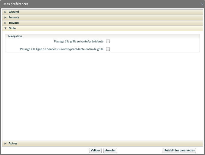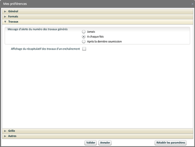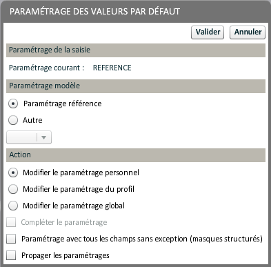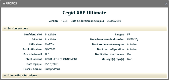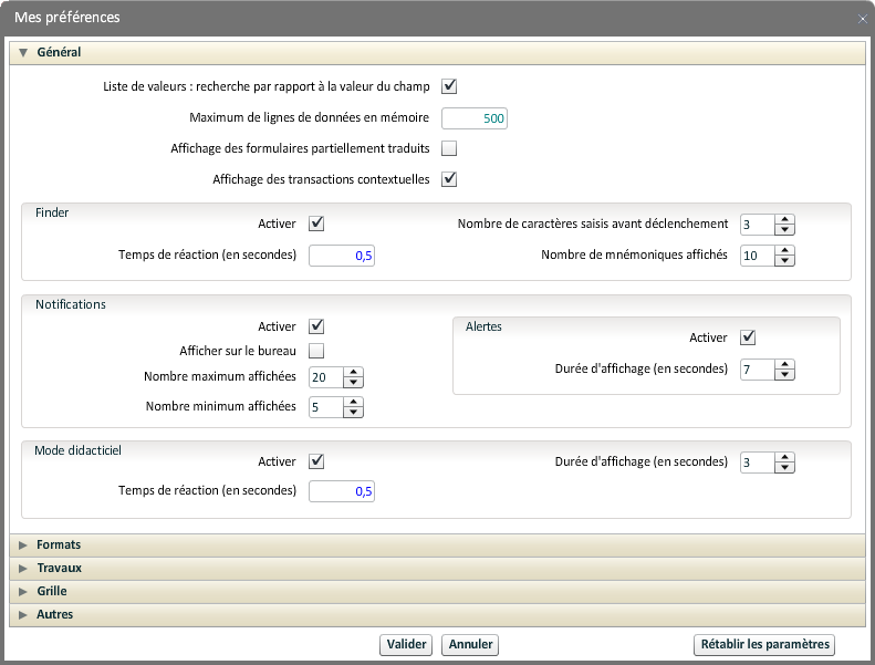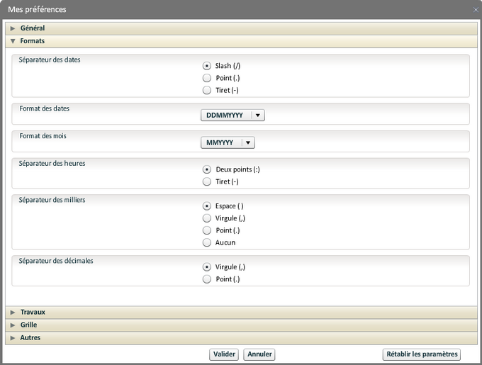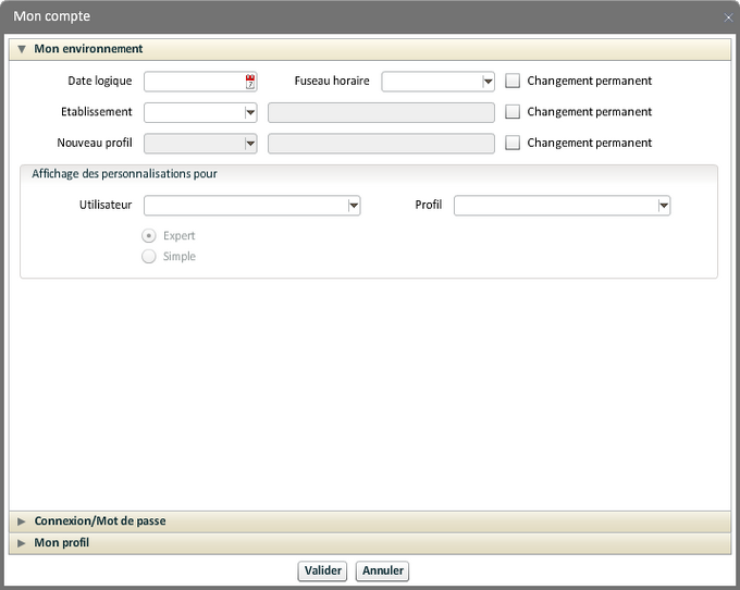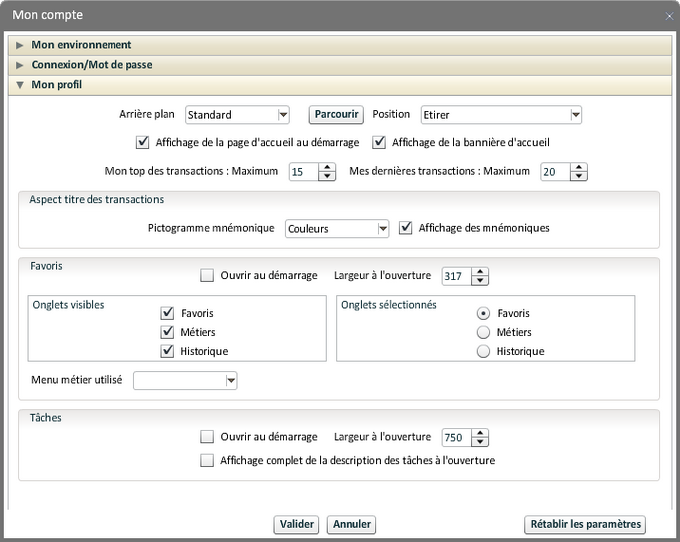 Sont indiquées ici des informations sur l'environnement de travail de l'utilisateur connecté. Certaines sont modifiables, les changements sont appliqués après validation.