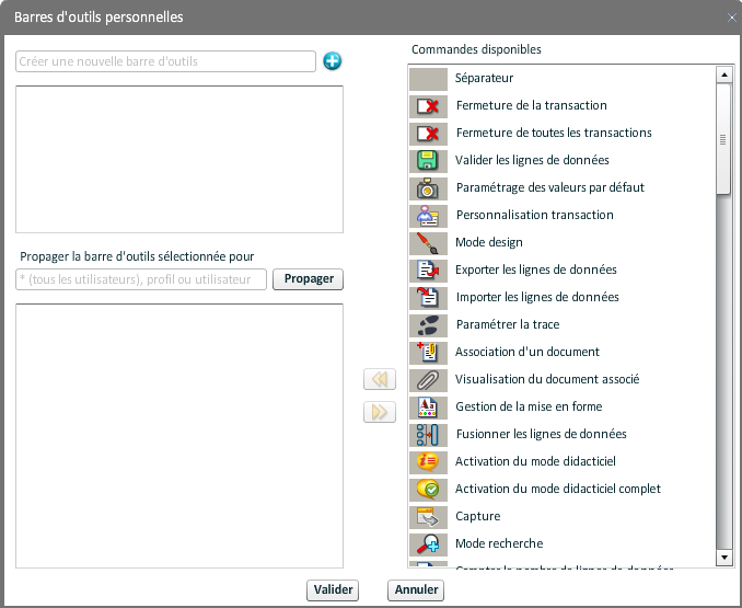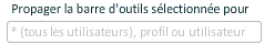 Pour propager une barre, la sélectionner dans "Barres d'outils personnelles" et saisir l'utilisateur, le profil ou "*" (pour tous les utilisateurs) dans le champ