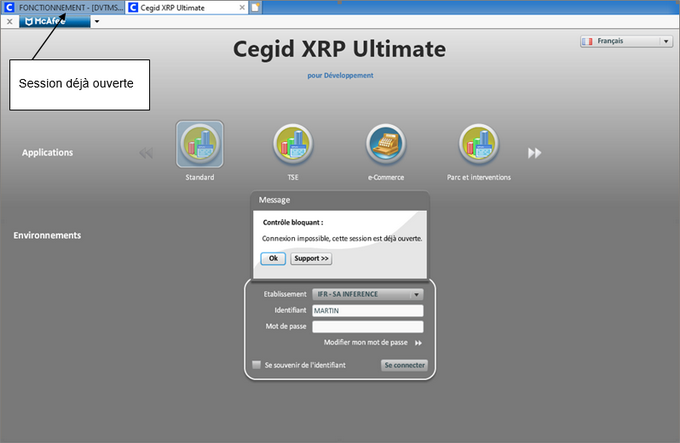 A noter qu'il est impossible d'ouvrir plusieurs sessions d'un même environnement du produit dans le même navigateur.