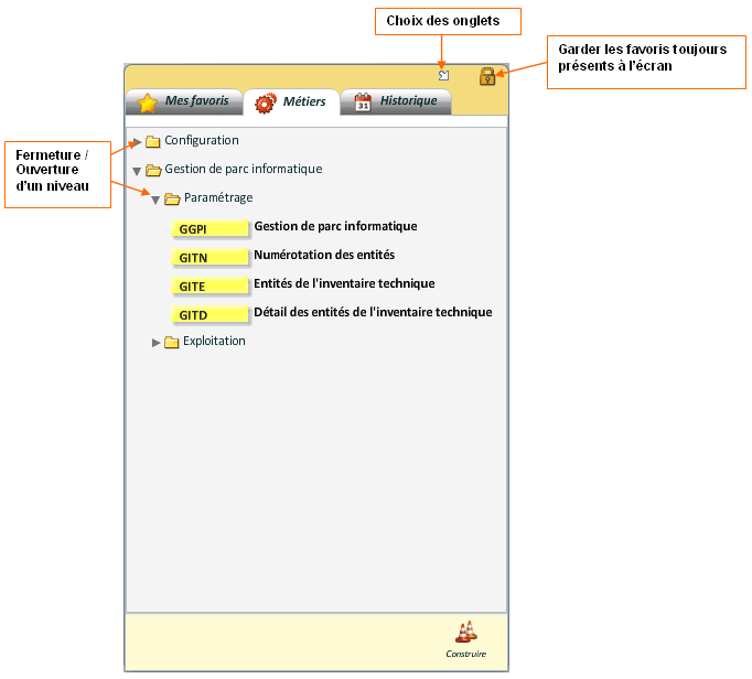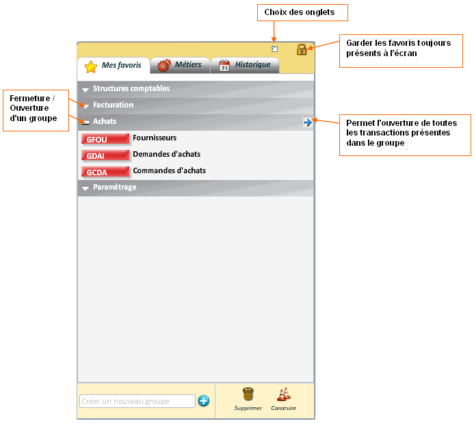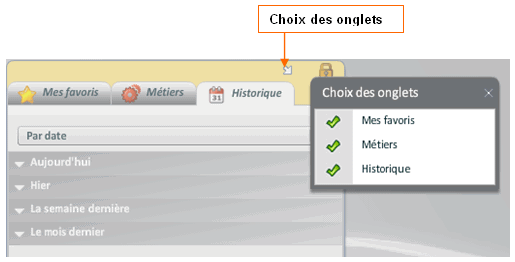 La fenêtre des favoris peut être active dès l'ouverture de l'interface utilisateur. Sur cette fenêtre, possibilité de choisir sa largeur à l'ouverture, les onglets visibles ainsi que celui sur lequel on se positionne par défaut.