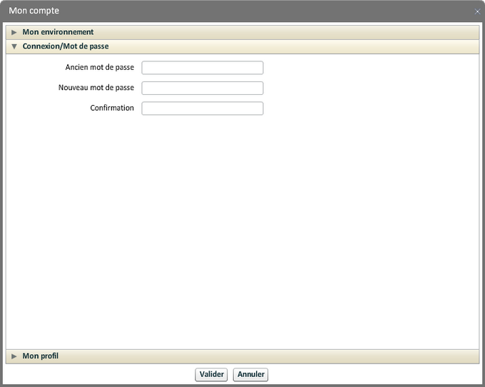 Trois niveaux : "Mon environnement", "Connexion / Mot de passe" et "Mon profil".