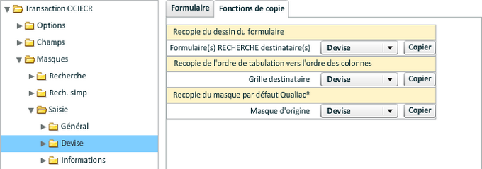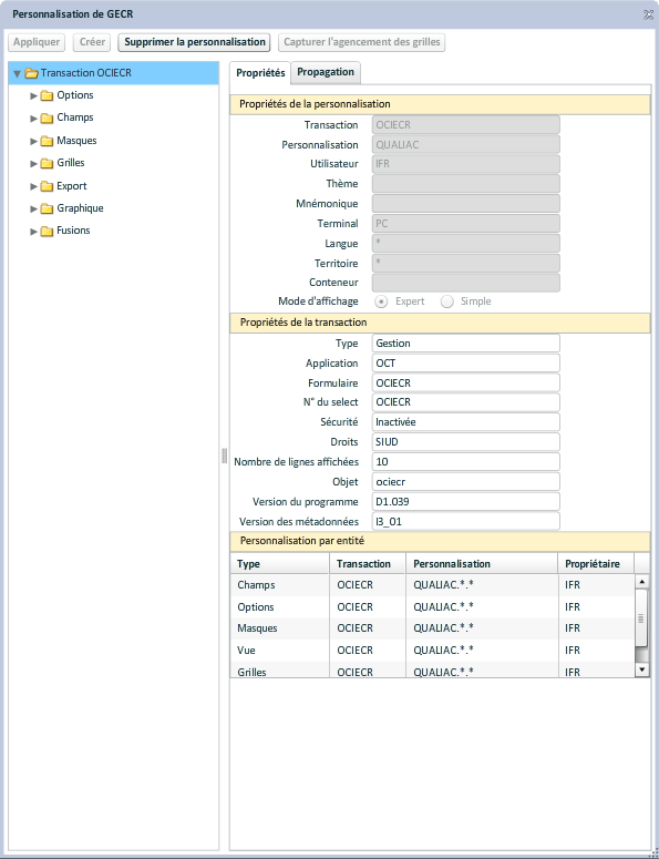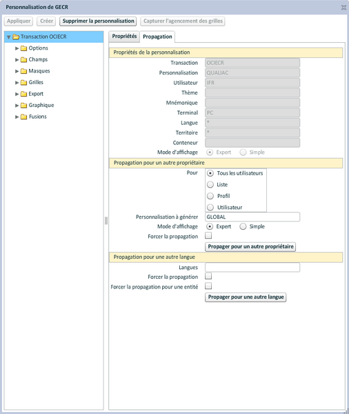 L'onglet "Propagation" permet la copie de la personnalisation d'une transaction d'un niveau vers un autre.