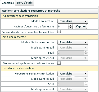 A l'ouverture, après une recherche ou après une synchronisation, il est possible de définir un des modes suivants : formulaire, grille, mosaïque, graphique, recherche (à l'ouverture uniquement), totaux (après une recherche ou une synchronisation) ainsi que :