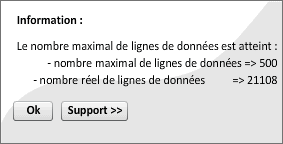 Cocher "Comptage nombre de lignes réelles" aboutit au message suivant lorsque le nombre de lignes de données dépasse le nombre maximum de lignes de données en mémoire.