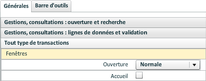 "Accueil" permet d'indiquer que la fenêtre sera de type Accueil (barre de titre de la fenêtre simplifiée, couleur des barres de titre et d'état spécifique (blanc par défaut), l'ouverture d'une transaction synchronisée réduit la fenêtre principale qui sera restaurée lorsqu'elle redeviendra la fenêtre courante).