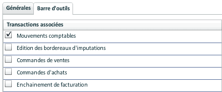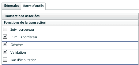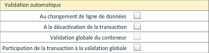 Cocher "Participation de la transaction à la validation globale" pour indiquer que la transaction fera partie de la validation globale. Cette option n'est pas accessible pour les transactions qui appartiennent à un conteneur dont la "Validation globale du conteneur" est cochée.