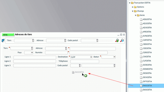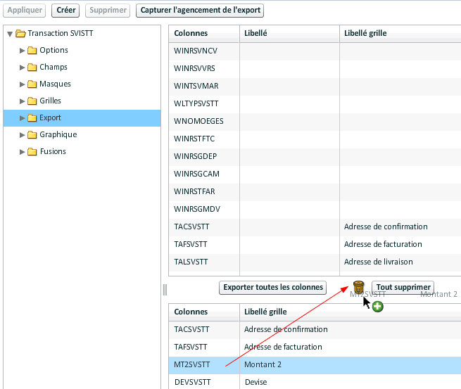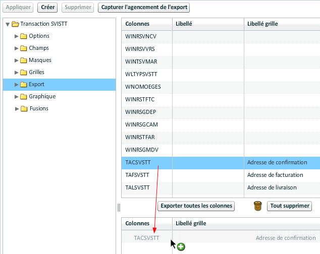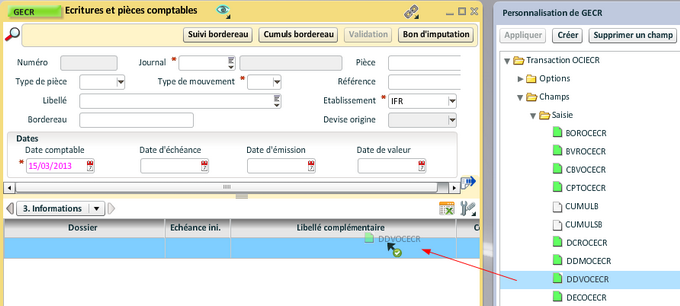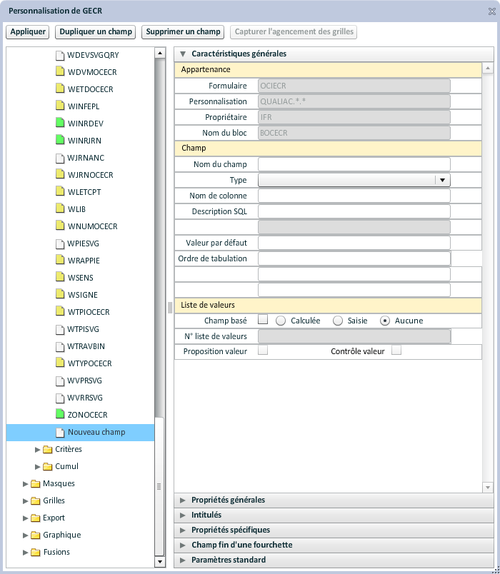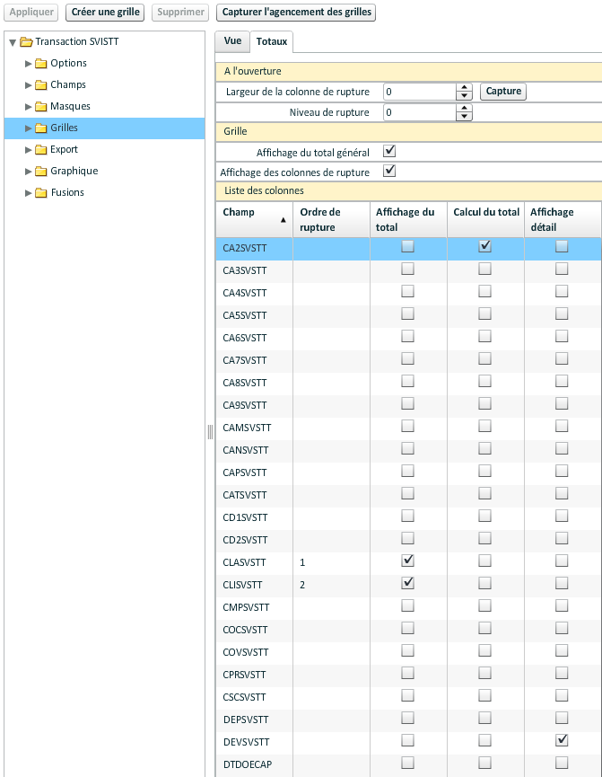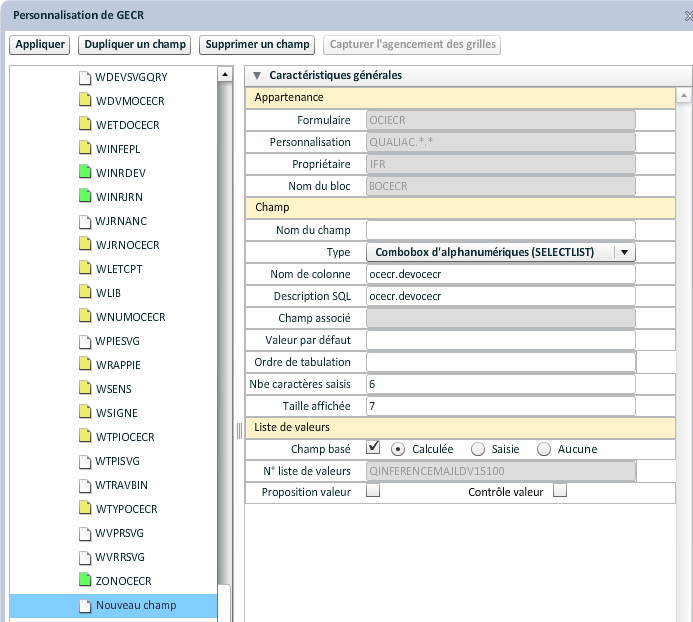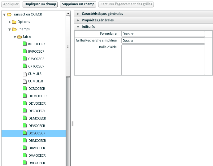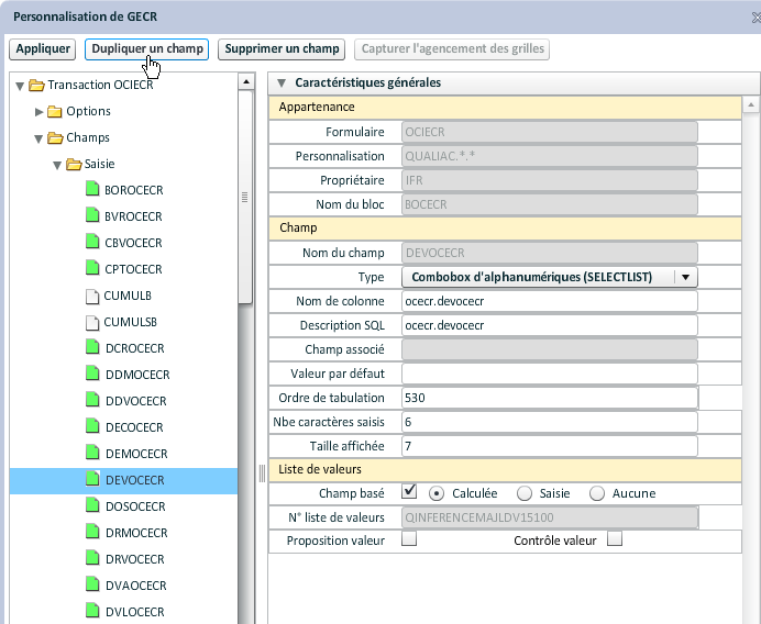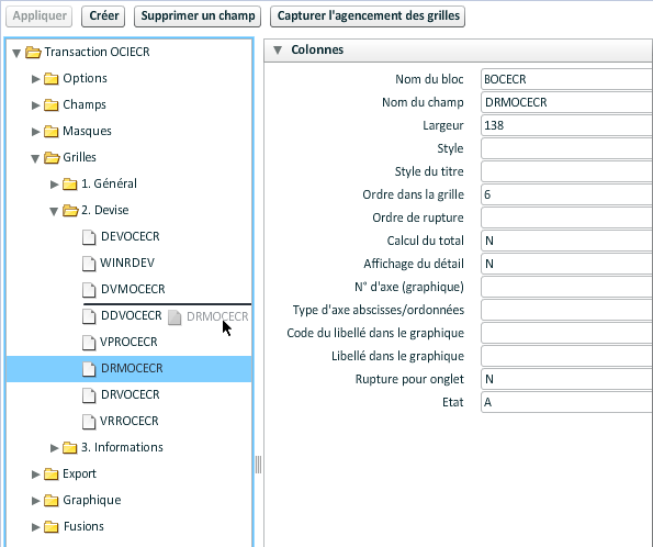 Le paramétrage s'effectue obligatoirement à partir de champs qui doivent être présents dans la grille de la transaction. Il faut sélectionner un champ de la liste au-dessus et le faire glisser dans une des caractéristiques.