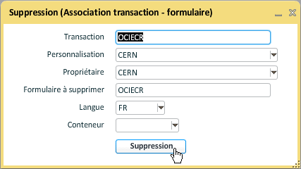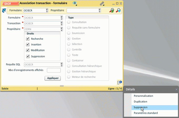 En plus du bouton "Supprimer la personnalisation" affiché lorsque l'on sélectionne la transaction dans l'arbre, il est possible de supprimer une personnalisation depuis les associations transaction - formulaire (GAOF).