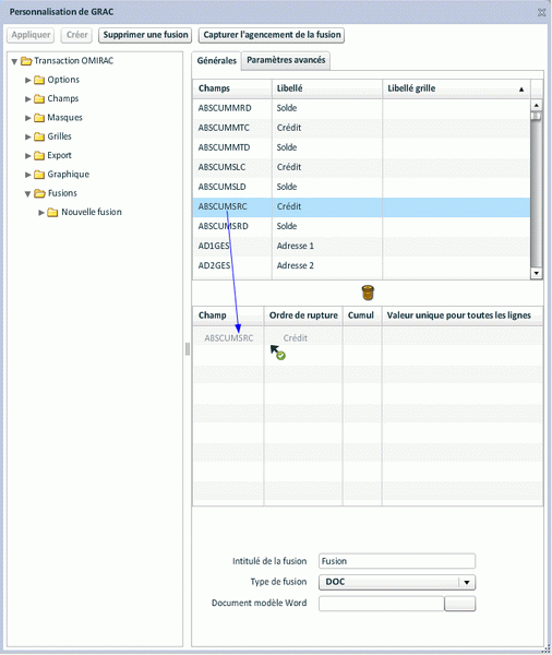 - sélectionner le champ à fusionner dans la liste des champs de la transaction et glisser dans la liste des champs du document. Répéter l'opération s'il y a plusieurs champs.