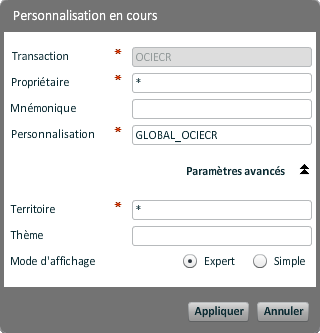 Cette fenêtre s'ouvre pour création si aucune personnalisation n'existe.
