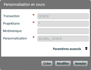 Dans cette fenêtre, "Créer" permet de sauvegarder une nouvelle personnalisation (saisir au moins son nom et le propriétaire), "Modifier" permet de sauvegarder les modifications pour la personnalisation en cours.