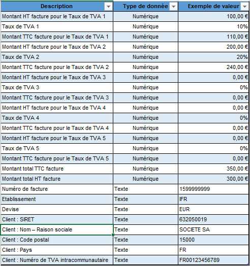 - Numérique : valeur en unité divisionnaire élémentaire de la monnaie locale (en Euros, centimes) sans point décimal et sans espace ;