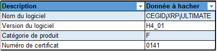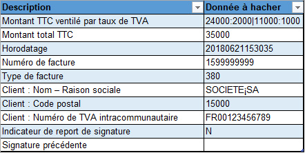 La réalisation du champ « Montant TTC ventilé par taux de TVA » donnant : TTC1:TauxDeTVA1|TTC2:TauxDeTVA2|.../...|TTC5:TauxDeTVA5 en ne renseignant que les ventilations utilisées. Dans notre exemple, la chaîne à hacher est : « 24000:2000|11000:1000 ». Ils sont triés du plus grand taux de TVA vers le plus petit.