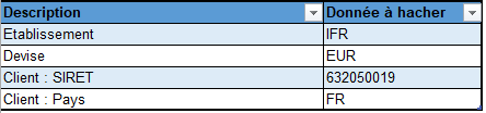 La chaîne à hacher est complétée par l'établissement, la devise, le SIRET du client et le pays.