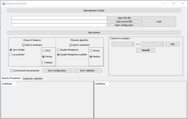 L'objectif de cet outil intégré dans le module de dédoublonnage de données est de détecter des doublons parmi des données selon certains critères. Il s'agit de mettre en évidence des couples de données similaires afin de les supprimer.