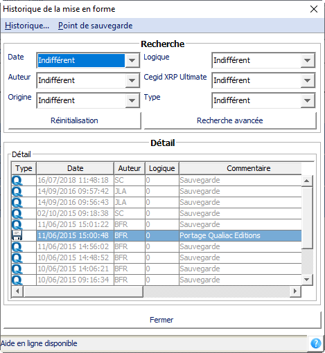 Un historique est une trace laissée à titre informatif suite à une modification dans une mise en forme. On y trouvera donc, entre autres, la version de Cegid XRP Ultimate, la version de la mise en forme, l'auteur ainsi qu'un commentaire apportant des précisions sur les travaux effectués. On distingue deux types d'historiques : ceux créés par les utilisateurs de l'interface du Module Editions et ceux générés automatiquement par l'interface. Les premiers sont libres, les seconds sont non modifiables.