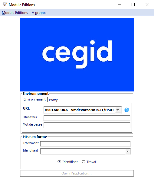La partie "Environnement" permet de sélectionner l'environnement sur lequel on souhaite se connecter. De plus, il faut saisir l'utilisateur et son mot de passe.
