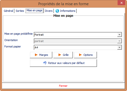 Ce bouton permet de récupérer les valeurs par défaut de la mise en page sélectionnée. Toute modification de la mise en page sera supprimée (message de confirmation avant validation).