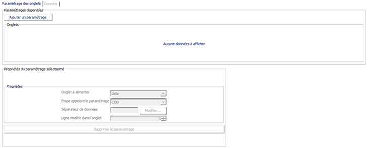 Tant qu'il n'existe pas de paramétrage des onglets, il n'est pas possible d'accéder à l'onglet des données pour spécifier les colonnes du fichier Excel. Les lignes de données, doivent être configurées comme dans le cas d'une structure CSV.