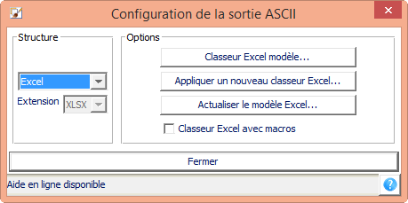 Cette structure permet de générer un fichier Excel. Par défaut, le fichier aura comme extension xlsx. Pour avoir une extension xlsm, dans l'écran de configuration de la sortie ASCII, il faut cocher "Classeur Excel avec macros".