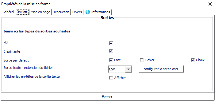 - Sortie texte - extension du fichier : Dans le cas où la mise en forme a une sortie ASCII, il est possible de configurer l'extension qui sera utilisée. Si la sortie a été faite avec un assistant CSV ou Excel, l'extension n'est pas modifiable depuis cet écran. Le bouton "Configurer la sortie ASCII" permet de modifier la structure de la sortie ASCII, ainsi que son extension ;