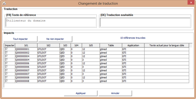 - Sur la partie inférieure, figure une grille listant les objets partageant le même terme de référence et qui, de fait, pourraient être impactés par le changement de traduction en cours. La plupart du temps, la case à cocher figurant dans la colonne "Impacter" de cette grille permettra de préciser si la nouvelle traduction devra ou non être propagée aux objets en question. De façon générale, on ne pourra pas décocher cette colonne pour les objets qui n'ont pas encore de traduction pour la langue cible.
