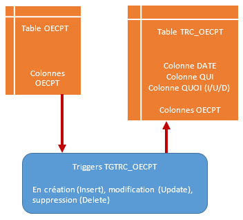 Chaque modification de la table OECPT est tracée dans la table TRC_OECPT avec les informations suivantes : date, qui, quoi (I/U/D).