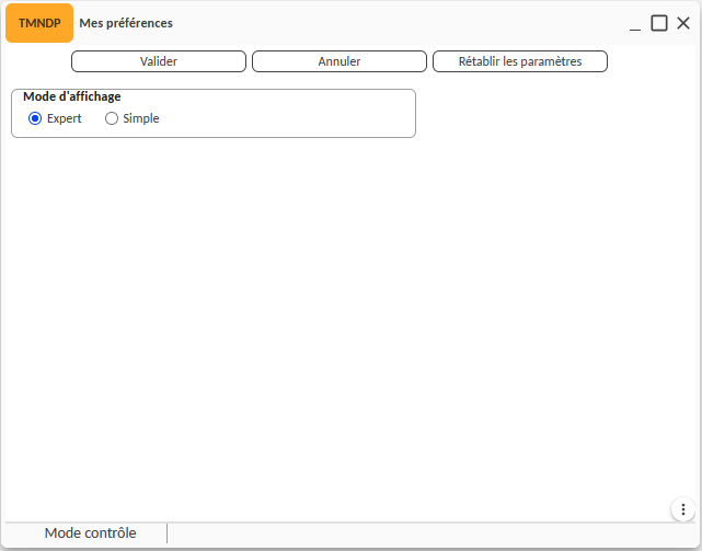 La transaction TMNDP permet la gestion de l'environnement de travail dans l'interface utilisateur avec la technologie HTML5. Pour l'ergonomie UI01 : accès par le menu "Mon Profil", commande "Mes préférences".