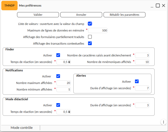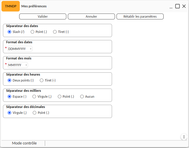 "Mes préférences" regroupe, dans l'interface utilisateur, des informations sur l'environnement de travail de l'utilisateur connecté à Cegid XRP Ultimate. Certaines sont modifiables, les changements sont appliqués après validation.
