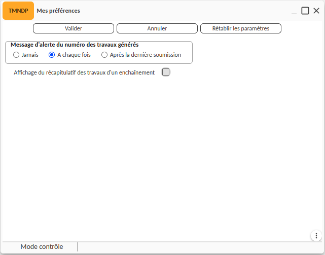 Au choix, au lancement des travaux, le message n'est jamais affiché, il est affiché après chaque lancement, ou le message est affiché seulement à la fin des travaux générés.
