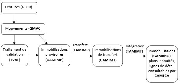Le paramétrage pour la création des fiches d'immobilisations est lu dans la gestion du paramétrage de la création des immobilisations (GAMPCI) grâce au type de transfert défini au niveau du compte (GCPT).