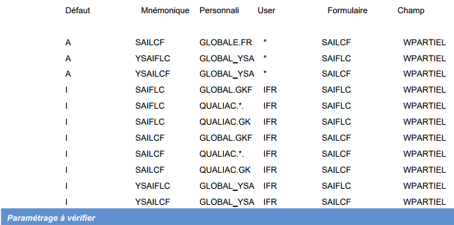 La vérification des soldes dans la saisie des factures concerne les lignes à facturer (SAIFLC ou SAIFLCC). La zone WPARTIEL doit avoir une valeur par défaut égale à "A". Les zones soldes factures ainsi que la zone précédente ne sont pas accessibles en saisie.