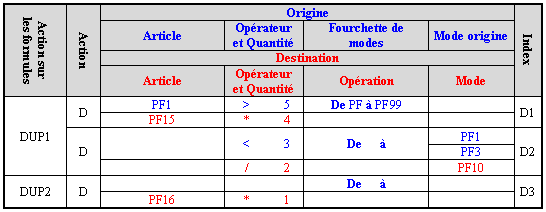 - Index D1 : pour la formule F1-1, une duplication de formule pourrait être faite, en remplaçant l'article PF1 par l'article PF15 et en multipliant les quantités par 4.