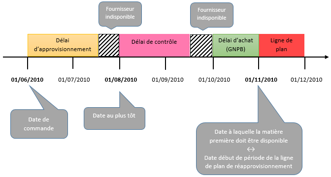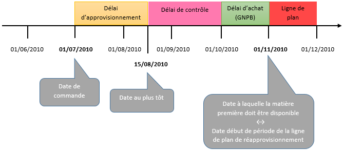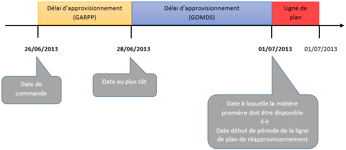 Le positionnement de la demande ou commande dans le temps est conditionné par la date de début de période de la ligne de plan. Cette date correspond à la date à laquelle la matière doit être disponible. A celle-ci est retranché un délai d'approvisionnement pour calculer les dates d'achat.