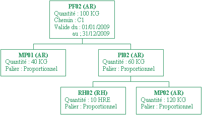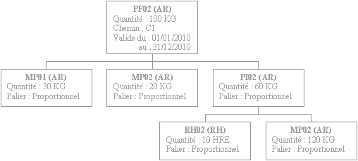 - Pour l'article de production recherché, une formule (GFNG) dont le chemin et le chemin du besoin sont égaux doit exister. Si plusieurs formules sont référencées pour le même article mais sur des chemins différents, c'est le chemin de la classe de plans qui sera utilisée. Sur ce chemin, s'il existe plusieurs formules concernant cet article sur des périodes différentes, on prendra en compte la formule pour laquelle la période de validité englobe la date de fin de période du besoin des stocks (SKCHBD).