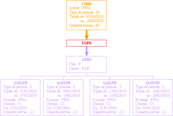 Par contre, comme on peut le voir sur le schéma, nous avons maintenant quatre lignes de plans. Cela s'explique par le fait que sur la période mensuelle de février 2010 nous avons quatre semaines. Donc, il y a quatre lignes de plans avec une quantité égale à 1/4 de la quantité initiale.