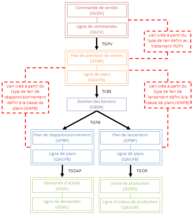 Au cours des différents traitements permettant de générer les ordres de production ou les demandes d'achats, des liens sont automatiquement créés.