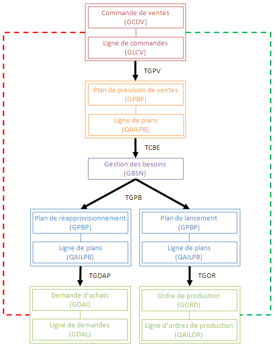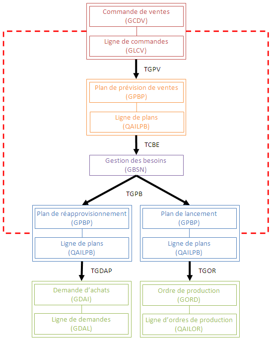 De plus, lors de la génération d'une demande d'achats (TGDAP) et de la génération d'un ordre de production (TGOR), il est possible de faire suivre les liens entre les commandes de ventes et le plan utilisé pour la génération de la demande d'achats ou de l'ordre de production.